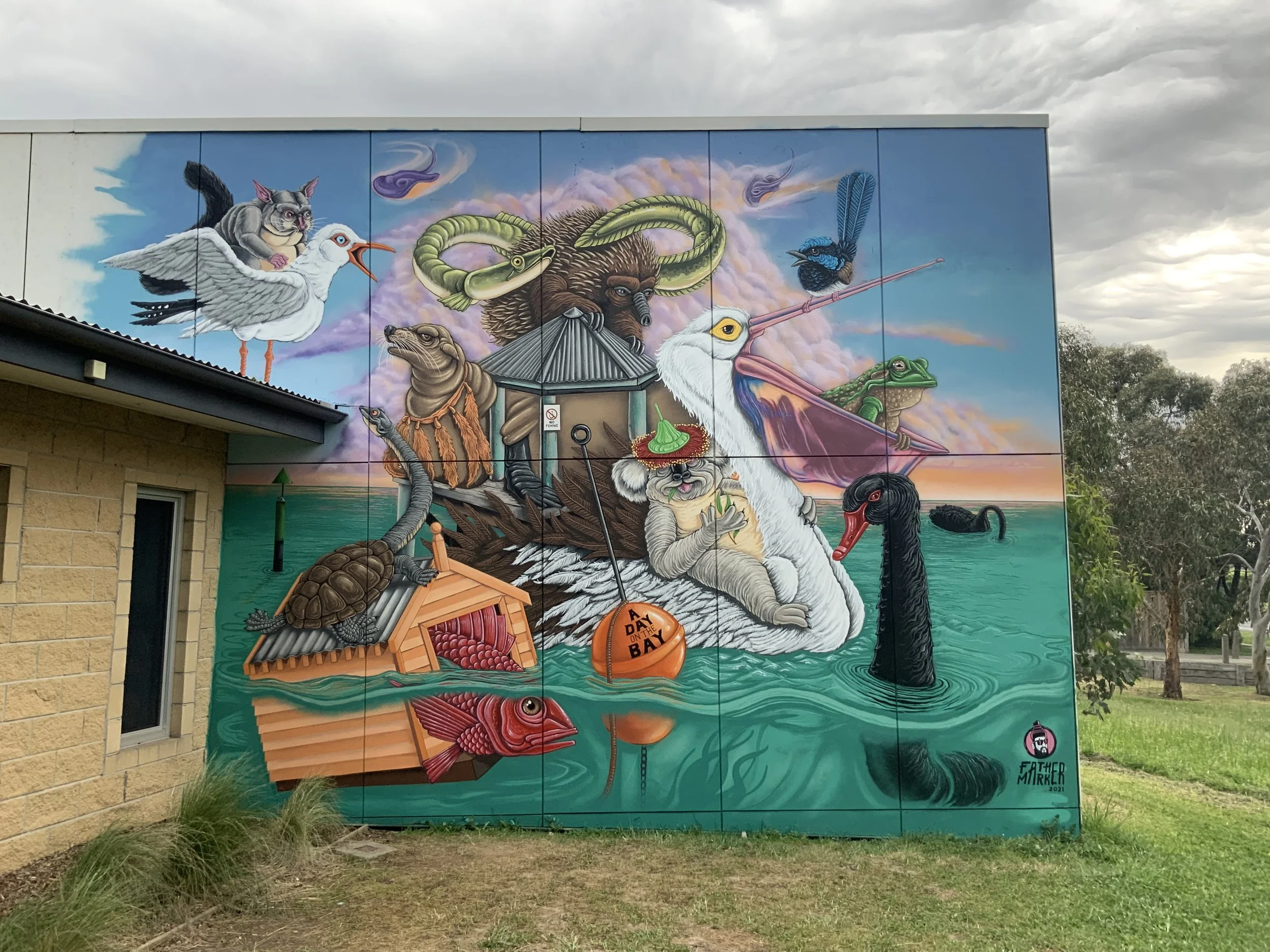 “A Day On The Bay” was created as part of a public art commission for Bentons Square Community Centre, following an Expression of Interest open to artists from the Mornington Peninsula. I was honoured to be selected to bring this vibrant mural to life in response to a brief calling for a landscape or seascape that showcased local flora, fauna, and reflected aspects of community life.