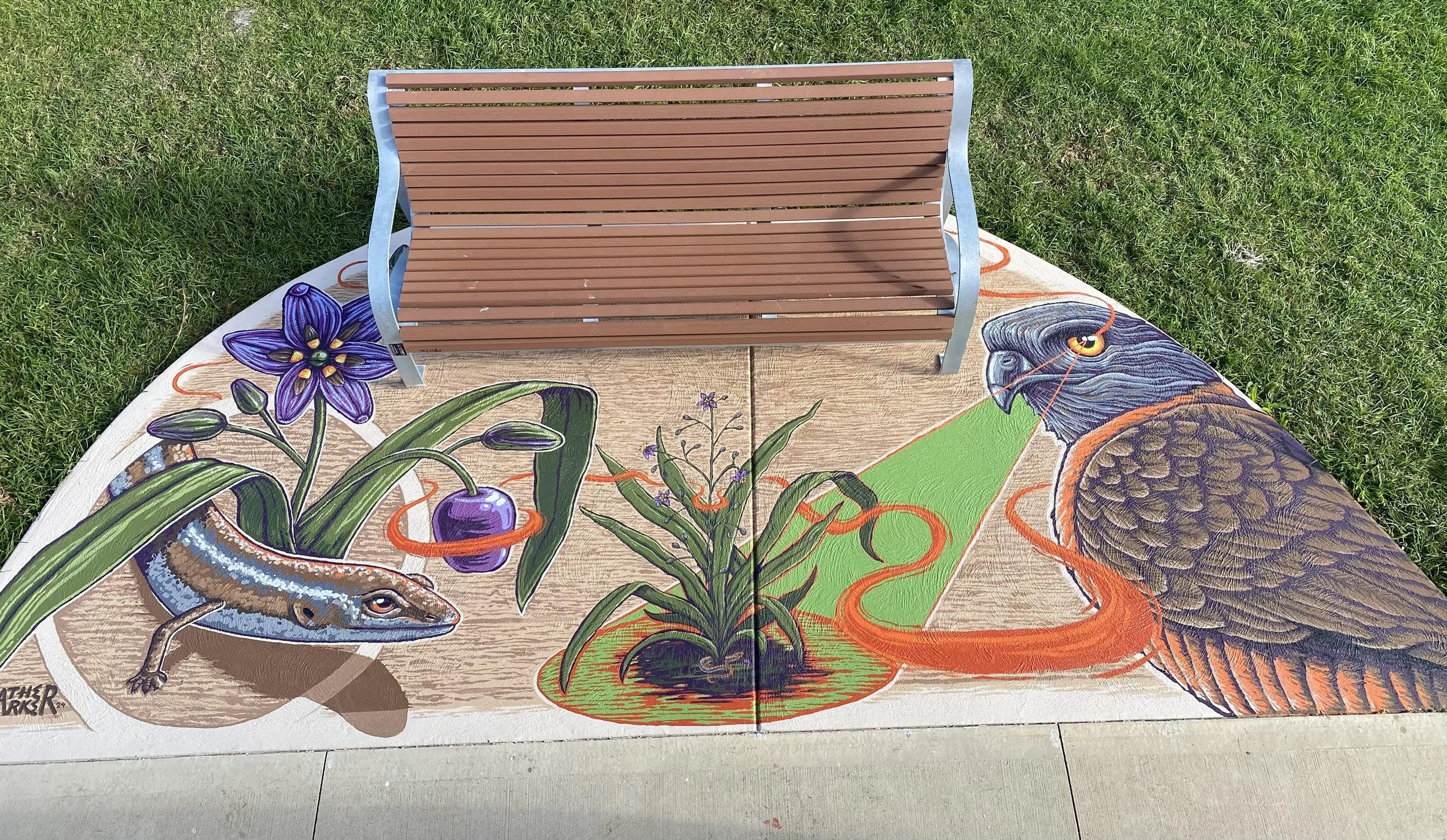 My contribution spans seven mural sites, painted on the concrete pads beneath newly installed park benches. These pads are part of a thoughtfully designed infrastructure encouraging rest, reflection, and sensory engagement with the creek’s environment—through sight, sound, and touch.