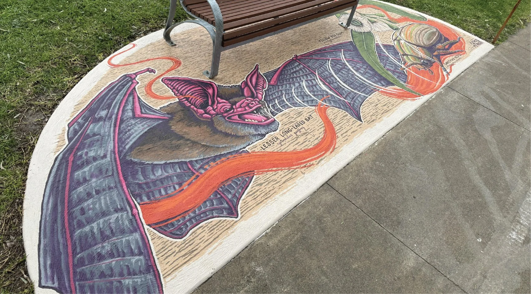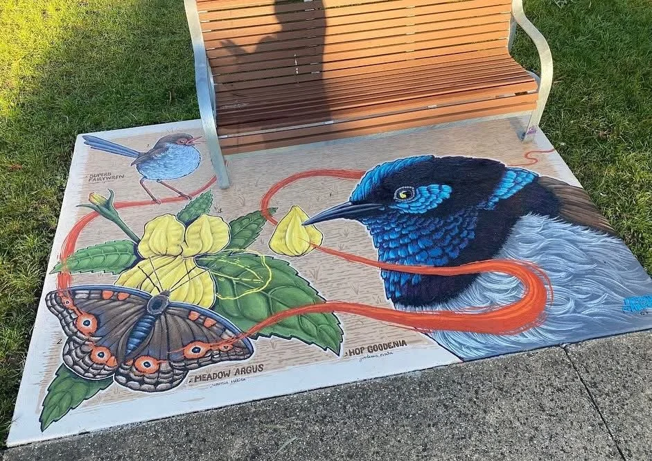 The project brief invited artists to explore themes of place, ecology, and community. My response focused on the localised food chains and ecological networks that thrive along the creek. Each mural highlights a key endemic species, paired with its primary food source and a native floral species that plays a supporting role in that mini-ecosystem. From pollinators to birds and insects, these painted pairings tell subtle but vital stories of interconnection, adaptation, and the shared life force running through Merri Creek.
