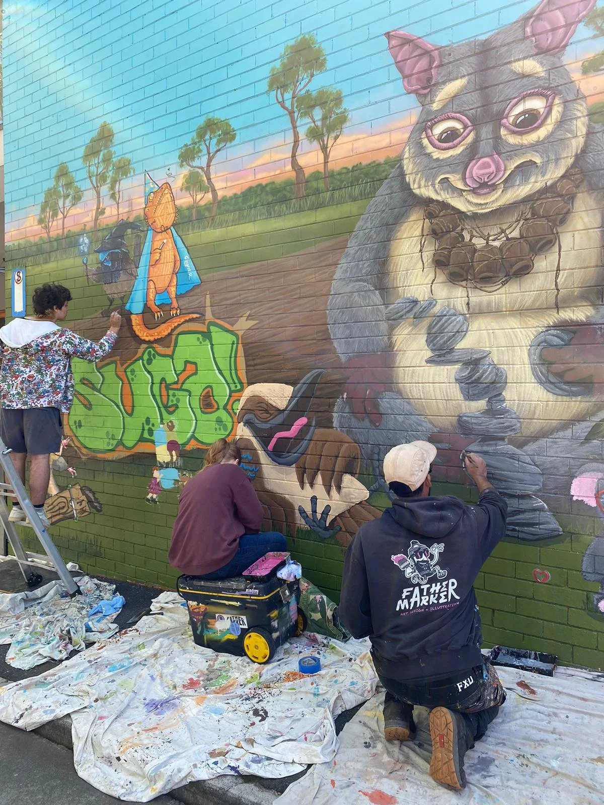 Over a series of evening workshops and ongoing conversations in our WhatsApp group, we developed a mural design inspired by the newly built natural playscape at Kareela Road. With incredible generosity, local shop owner Kaitlin and her family offered up their wall, transforming what was once a blank, grey surface into a colourful celebration of community and nature.