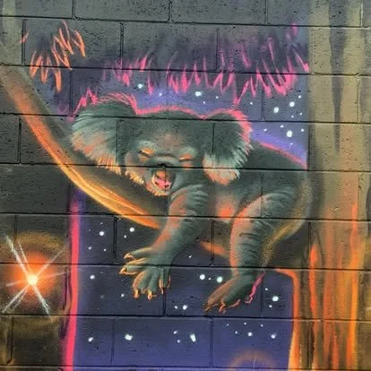 This large-scale mural, located on the exterior of the 1st Mornington Scout Group’s hall in Mitchell Street, Mornington, was commissioned through a $10,000 placemaking grant awarded by Mornington Peninsula Shire. Additional in-kind support was generously provided by local businesses in the form of materials, plant equipment, and technical assistance, reflecting the strong community spirit behind this project.