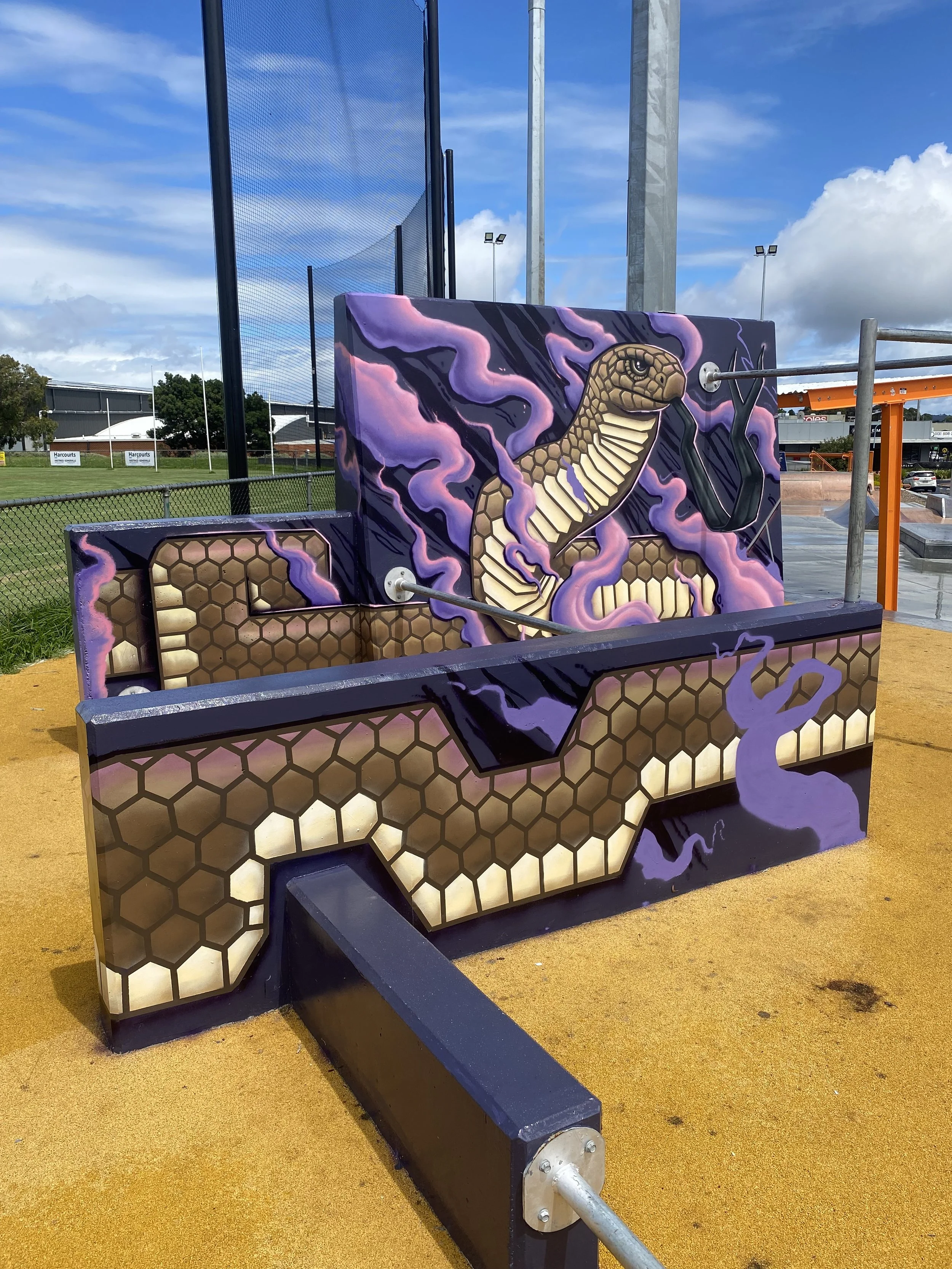 This mural, completed for the Somerville Parkour Gym as part of Mornington Peninsula Shire’s Arts and Culture program, presented one of the most technically challenging sites I’ve worked on to date. The gym's unique structure—featuring a network of irregular concrete blocks, low vertical planes, and climbing walls fitted with rock grips—required a highly considered and adaptive approach to design and execution.